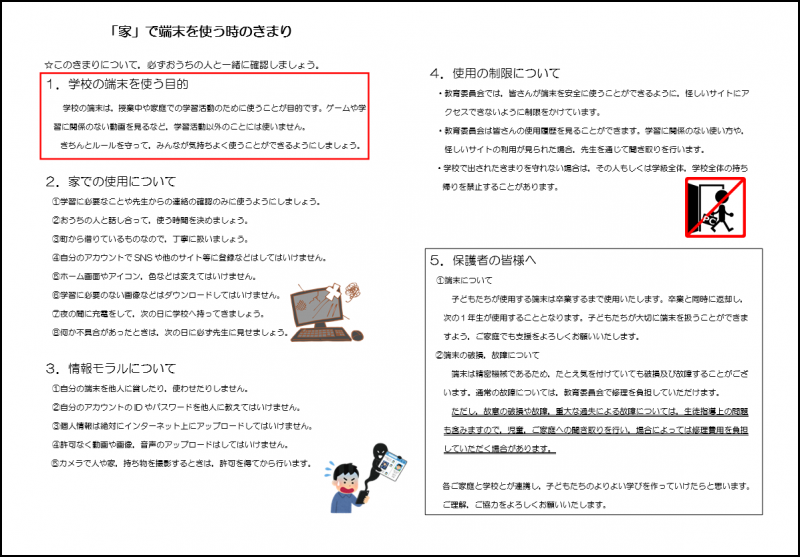 安全面だけに着目すれば活用を制限することも1つの手段ではありますが,道具は使ってこそ,その正しい利用方法を学ぶことができます。目的が子どもたちの将来につながる活用のためと考え,本校では今年度より「家で端末を使う時のきまり」を作成し,ご家庭にも配付させていただきました。情報モラルを含むタブレット端末の使い方については,子どもたちの成長段階に応じて,学校でも指導を重ねていく予定ですが,ご家庭におきましても,使い方のルールについてお子さんとぜひお話ししていただければ幸いです。