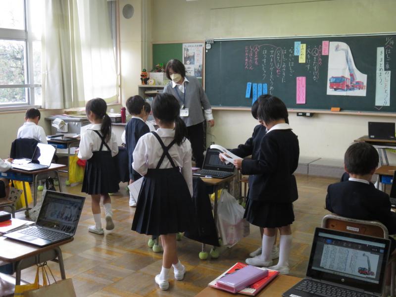 11月14日、1年担任の九笹教諭が研究授業を行いました。国語科「じどう車くらべ ~せつめいする文しょうをよもう~」の授業です。