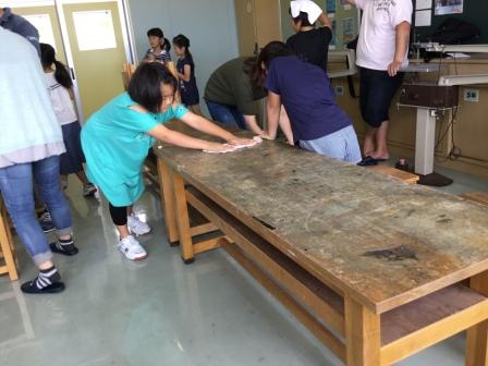3・4年生がプールサイドの床と更衣室,トイレの掃除をして