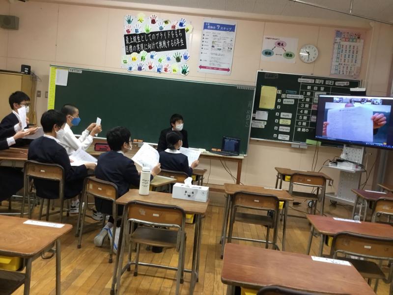 一人ずつ自己紹介をした後,「好きな○○は何か」を互いに質問し合い,「Great!」「That’s good!」「I see.」と聞いて反応したり,「Why do you think so?」と理由を問い返したりして,1往復半の会話を楽しみました。最後は,ビンゴゲーム。カードを画面越しに互いに選び,9つのマス目が一つずつ埋まるたびに「Reach!」「Bingo!」と歓声が上がり,跳びはねて盛り上がりました。ふり返りでは「またZoomでつながりたい!」「今度はちがう質問をして余喜小の友達のことをもっと知りたい」という記述が多かったです。