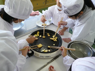 固いさつまいもに苦戦しながら包丁で上手に切ることができ,ホットプレートで美味しそうな焼き色もつけることができました。