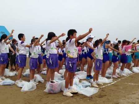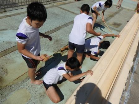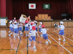 縦割り班全員で新聞紙の上に乗り,じゃんけんに負けると