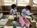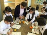 1・2年生が絵手紙教室の先生方からアドバイスを受けながら、旬の野菜や果物などを画材にお父さんやお母さん、お祖父ちゃんやお祖母ちゃんなどに感謝のメッセージを添えて絵手紙を書きました。