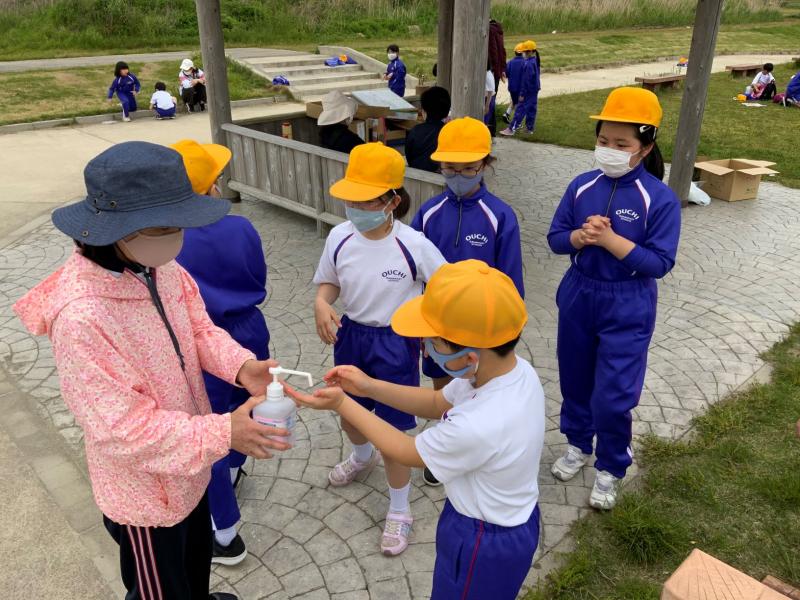 (昼食前と帰校後に全校で手洗いと,手指の消毒をしました。)