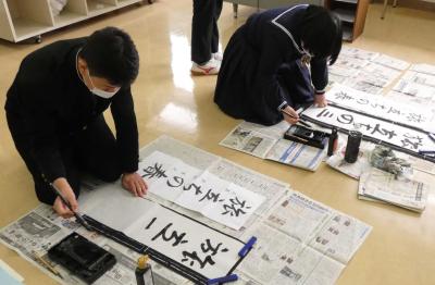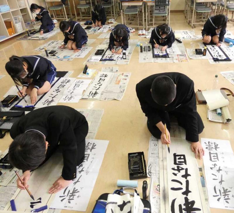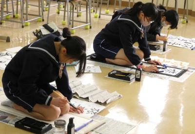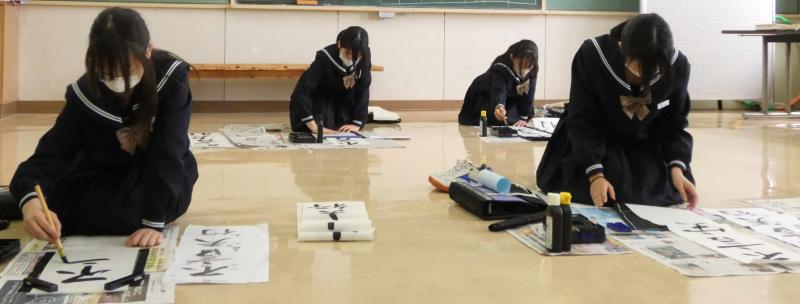 1年生「不言実行」・2年生「新たな目標」・3年生「旅立ちの春」というお題に真剣な表情で取り組む様子が見られました。今年の目標を漢字1文字でも表現しました。様々な漢字で表された目標を達成できるよう努力し、充実した学校生活にしましょう。