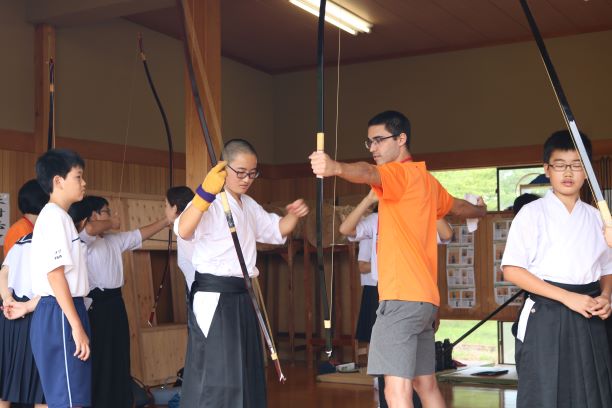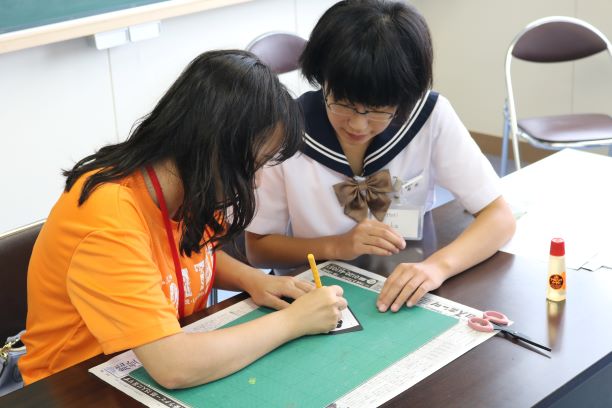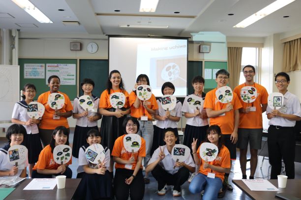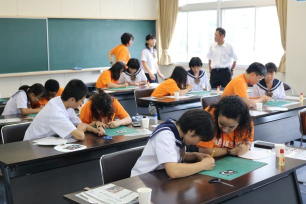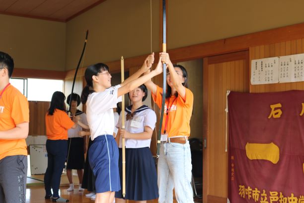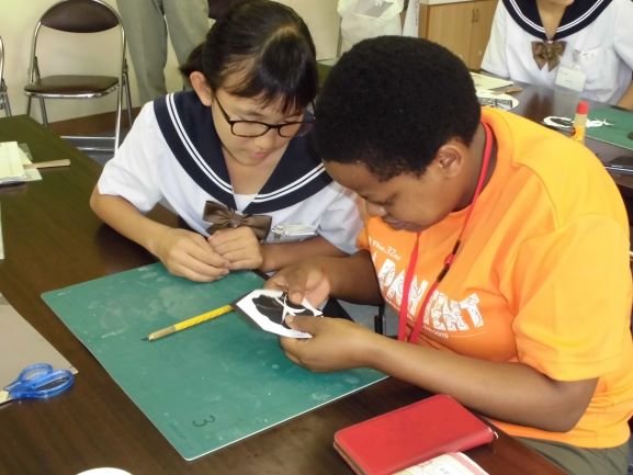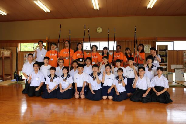当日は8人のアテンダント(ボランティア生徒)が中心となり,本校での体験のお手伝いをしました。弓道の実技体験では、自国で体験することができないとのことで、留学生はとても興味深く体験していました。また、切り絵によるうちわづくりでは、生徒が作成のお手伝いをしながら日本の「和」を感じ取っていただきました。