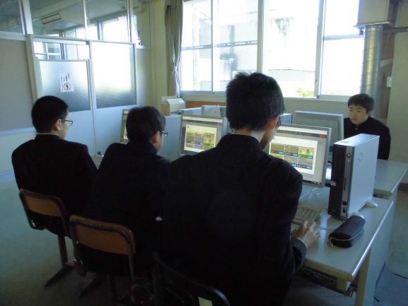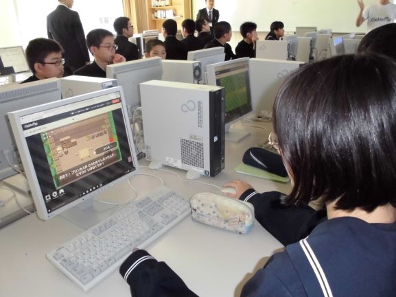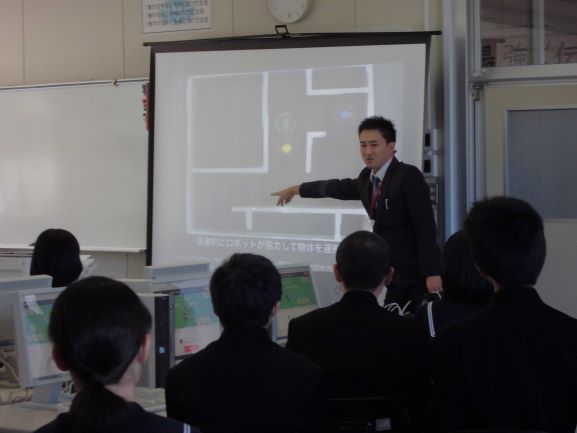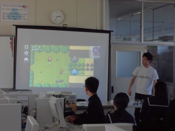 2年生の技術の授業の一環として、石川工業高等専門学校の越野先生と、その教え子で、若くしてゲーム制作会社を立ち上げ活躍されている寺本さんをお招きして、プログラミング教室が開かれました。