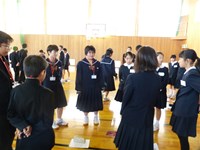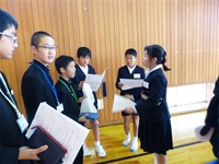 まず全員が体育館に集合し、4~5人のグループに分かれ、それぞれのグループで英語で自己紹介をしました。次にALTのマシュー先生が中心となって、簡単な前置詞の使い方について練習しました。映像を使い、歌いながらのレッスンに、初めは緊張していた小学生も次第にグループのメンバーと打ち解けていきました。その後、中学校の校舎をめぐりながら「〇〇教室はどこにある?」と英語を使って中学1年生にたずね、教室をさがしあてるゲームを行いました。目的地にたどりつき、1年生からカードをもらうと、満足そうに笑顔を見せる小学生たちでした。
