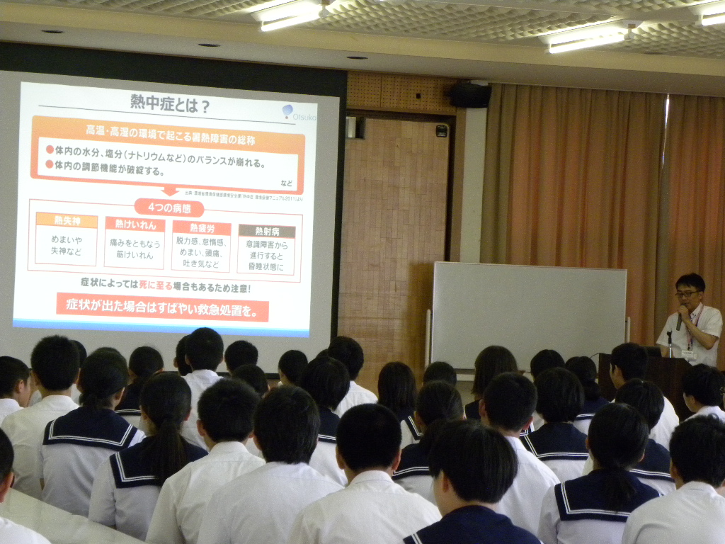 この日は大塚製薬株式会社から講師の先生をお招きして熱中症の症状や予防方法について詳しく教えていただきました。