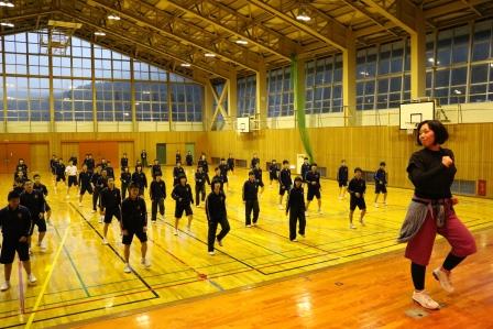 冬季合同トレーニング恒例特別メニューで「ダンスエアロ」を行いました。かほく市にある「クラブパレット」のインストラクター 石井 理子 氏に指導をしていただきました。少しきつかった生徒もいたようですが、楽しみながら体力づくりができました。