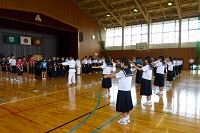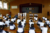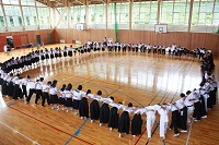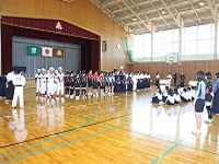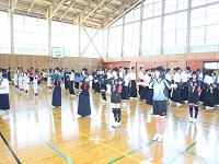 石川県中学校総合体育大会に向けて激励会が行われました。北信越や全国への切符をかけた負けられない戦いに向けて、各部のキャプテンが決意を表明しました。最後には、全校で円陣を組んでチーム邑知の勝利を願いました。