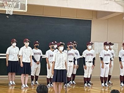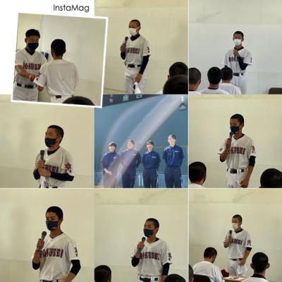 『頼りないキャプテンでしたが、ついてきてくれてありがとう。素晴らしいメンバーで戦えたことが嬉しい。3年生いっしょに頑張ってきてくれてありがとう。2年生、自分が頼りなくて嫌になることもあったと思うけど、支えてくれてありがとう。1年生、2年生が怒るのは1年生のため。怒ってくれる人を悪く思うのではなく、感謝してほしい。マネージャー、サポートありがとう。マネージャーがいてくれなかったら、今はありません。支えてくれてありがとう。みんながチームのためにしてくれたことの方が多いと思うけど、一緒に野球できて楽しかった。ありがとう。』
