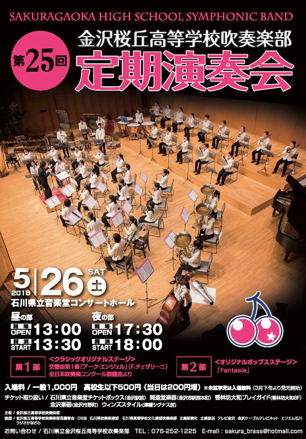 【金沢桜丘高等学校吹奏楽部第32回定期演奏会】 日 時 2025年6月8日(日)昼の部13:30開演,夜の部 18:00開演(以上2回公演) 会 場 石川県立音楽堂コンサートホール(金沢市昭和町20-1) 内 容 第1部クラシック・オリジナルステージ 第2部ポップスステージ 入 場 料 [前売]一般1,000円 高校生以下500円 未就学児無料 [当日]一般1,200円 高校生以下700円 未就学児無料 |