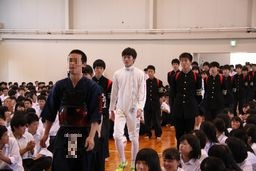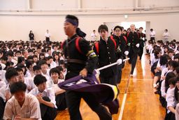 引き続いて全国大会に向けた壮行式、野球部の県大会壮行式が実施されました。応援団が勢いよく入場し、続いて全国大会出場選手、野球部が入場しました。