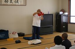 まず、救急車が到着するまでの処置が生存率に大きくかかわってくるという説明を受けたました。引き続き心配蘇生の方法を聞き、胸骨圧迫と人工呼吸を訓練人形を使って練習しました。その後AEDを実際に使った練習もしました。最後に熱中症の対処法についても学び、講習を終了しました。