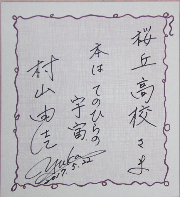 集英社の文庫本100冊と、村山さんのサイン入り色紙や本も贈呈していただきました。これから桜高生みんなで大切に読んでいきたいと思います。素晴らしいご講演をしてくださった村山由佳さんに心からの感謝の言葉をお伝えしたいです。ありがとうございました。