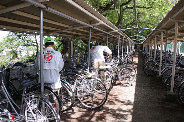 自転車組合の方に自転車の安全点検を行って頂きました。1台1台点検・確認し、ライトが点かない、ブレーキの利きが弱い、チェーンにゆるみがあるなど整備不良のものには安全点検カードを付けていきます。整備不良の自転車は早急に直し、交通規則・マナーを守って事故が起こらないように注意しましょう。