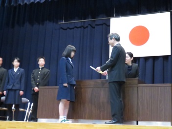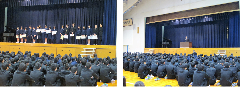 の栄誉を讃えました。引き続き行われた、学年末の終業式では、学校長から、挨拶の大切さ