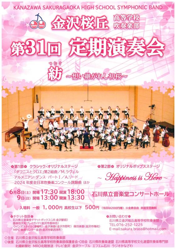 【金沢桜丘高等学校吹奏楽部第32回定期演奏会】 日 時 2025年6月8日(日)昼の部13:30開演,夜の部 18:00開演(以上2回公演) 会 場 石川県立音楽堂コンサートホール(金沢市昭和町20-1) 内 容 第1部クラシック・オリジナルステージ 第2部ポップスステージ 入 場 料 [前売]一般1,000円 高校生以下500円 未就学児無料 [当日]一般1,200円 高校生以下700円 未就学児無料 |