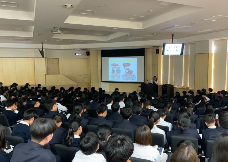 2024年5月15日 07時54分1年生を対象に、金沢東警察署 交通第一課 企画係長の坂井知子様を講師としてお招きし、自転車のルールやマナーについてご講演いただきました。また、講演後には「自転車ルール・マナー検定」を受け、理解を深めました。