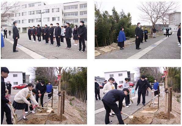 最初に卒業生の代表生徒が植樹のことばを述べ、梅本校長、倉本同窓会事務局長が謝辞を述べました。その後、3年生の各クラスの同窓会幹事(各ホーム男女各1名)が土掛けを行いました。