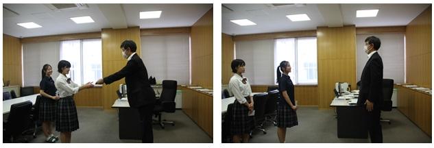 本日12:20より、全日本吹奏楽コンクールに出場する吹奏楽部と、国民体育大会に出場する水泳部、バレーボール部(出場種目はビーチバレー)の生徒に、梅本校長から激励費が授与されました。