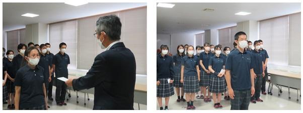 今年度の全国高校総体・総文祭に出場する選手への激励費授与式が行われました。総体に出場する剣道部、総文に参加する筝曲部・放送部・文芸部・新聞部・郷土研究部に、正村校長からそれぞれの部への心温まる言葉とともに激励費が手渡されました。