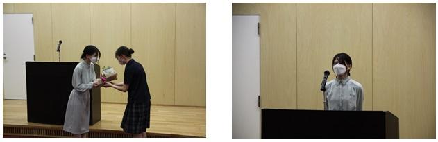 また、終業式の後、国語科の松本美優先生の離任式が行われました。松本先生からお別れのあいさつの後、生徒代表からの花束贈呈がありました。