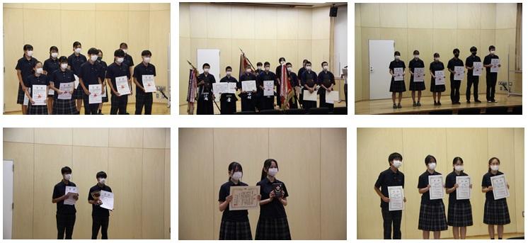 県総体・総文が終了し、本校で活躍した部活動の表彰伝達式が行われました。今年度は男子バスケットボール部・男子テニス部・陸上競技部・柔道部・剣道部・空手道部・弓道部・ハンドボール部の8つの運動部とESS部・筝曲部・吹奏楽部・放送部の4つの文化部と、将棋大会で入賞した生徒が表彰を受けました。