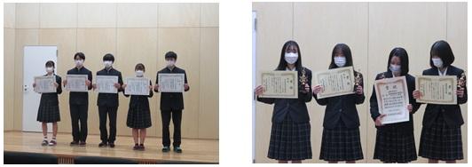 初めに、表彰伝達式が行われました。剣道部・女子バレーボール部・柔道部・吹奏楽部・放送部・ESS部・アクティブサイエンス部の各部活動の他、全国読書体験記コンクールの表彰が行われました。