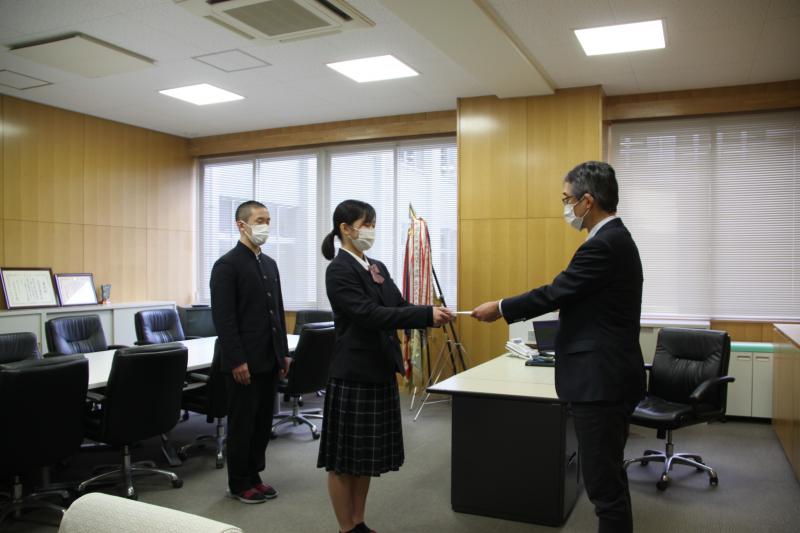 校長室において、「令和3年度 剣道部 特別強化費」が正村校長先生から剣道部代表生徒に授与されました。