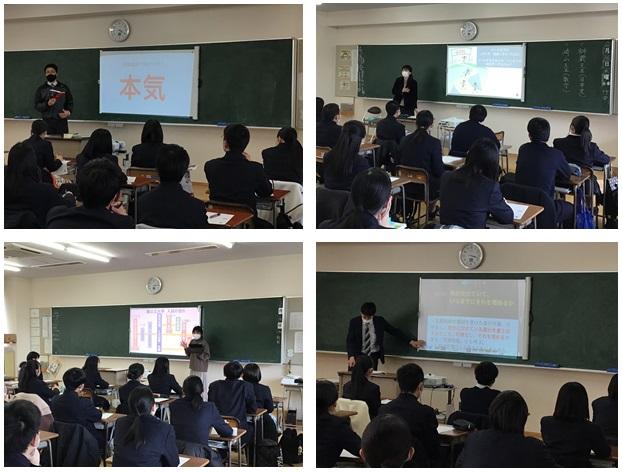 2月16日(水)7限目に、3年担任の先生方による、「2年生に語る会」が各クラスで開かれ、前後半で2名の先生方からお話を聞くことができました。3年生は1月の共通テストやその後の私立大学入試を経て、いよいよ2月25日(金)から国公立大学入試前期日程が始まります。その3年生の「リアルタイムな現状」や「心構え」、「今のうちにすべきこと」、「真の受験勉強とは」などなど、生徒達はメモをとりながら集中して真剣に聞き入り、刺激を受けていました。