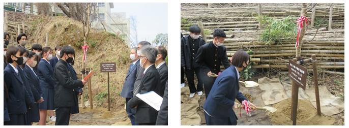 令和3年度の卒業記念植樹式が行われました。本年度(第74期)卒業生を代表して、各クラスの同窓会クラス幹事による「山桜(やまざくら)」の植樹が行われました。生徒代表からはこの桜の成長を願うとともに、自らの成長を誓う言葉が述べられました。