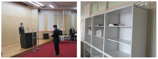 今年度の卒業生から、卒業記念品として「オープン書庫9台」が贈られることとなり、その目録が正村校長先生に渡されました。正村先生からは「文武両道の『文』を支える記念品を預かりました。後輩たちにとってに有効に、かつ大切に使っていきたいと思います。」との謝辞がありました。