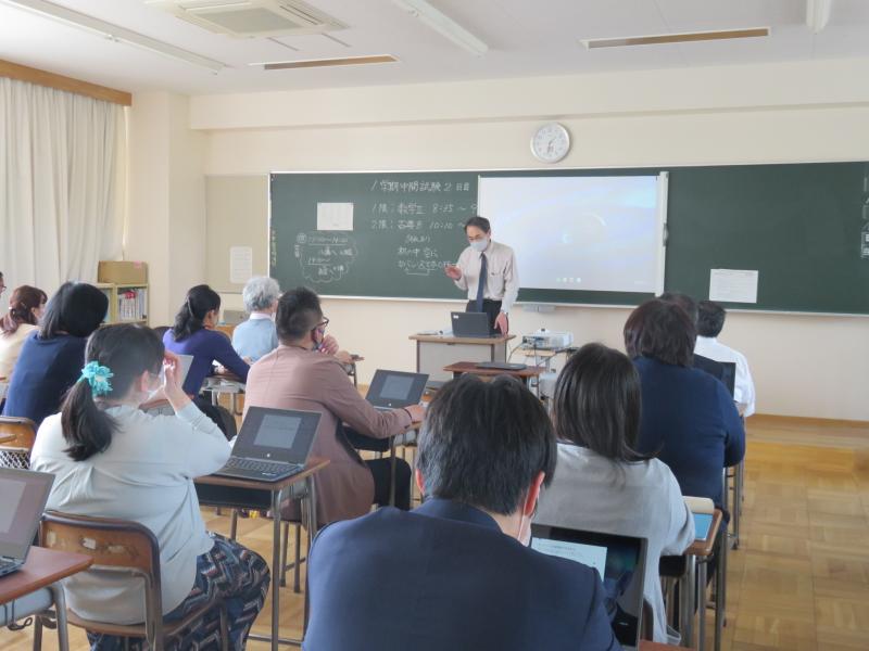 GIGAスクール構想実現のため、教職員を対象とした校内GIGA研修会が行われました。新型コロナウイルス感染症の流行が収まらない現状を踏まえ、オンライン学習やリモート学習に対応するため、「Chromebook」を利用した学習についての研修を行いました。
