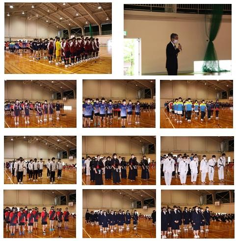 1学期中間試験終了後、6月に行われる総体総文の壮行式が行われました。参加・出場する3年生が体育館に集まり、各部の代表が抱負や決意を述べました。(1・2年生は教室で中継動画を見ました。)その後、正村校長から、「これまでの努力の成果を発揮して、悔いの残らぬように頑張ってほしい」との激励の言葉をいただきました。