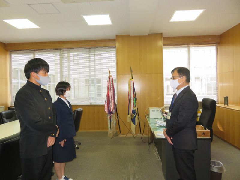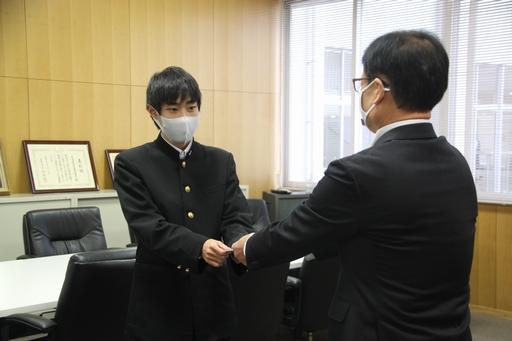 県新人大会にて勝ち進み、北信越新人大会へと出場を決めた空手道部・陸上競技部に対して、激励費・特別強化費の交付式が校長室にて行われました。