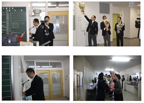 今年度はコロナウイルス感染予防のため、校内放送による先生方のあいさつとなりました。あいさつの後、職員室前での花束贈呈となりました。