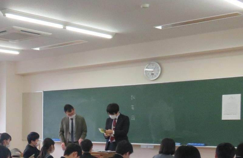 前田一弘校長先生から、今回の異動で新たに桜丘高校に赴任された15名の先生・職員の紹介と、新任の先生を代表して居村吉記教頭先生があいさつをされました。