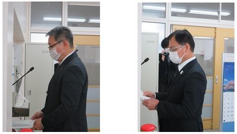 【新任の挨拶をする居村教頭先生】 【学校長訓話を述べる前田校長先生】
