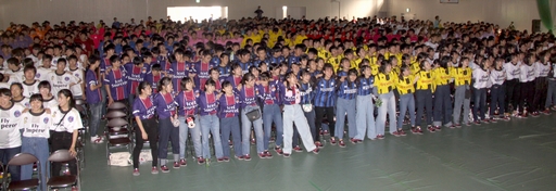 全校生徒で肩を組み校歌を合唱した後、生徒会の生徒を最前列にして全校生徒で記念写真を撮りました。
