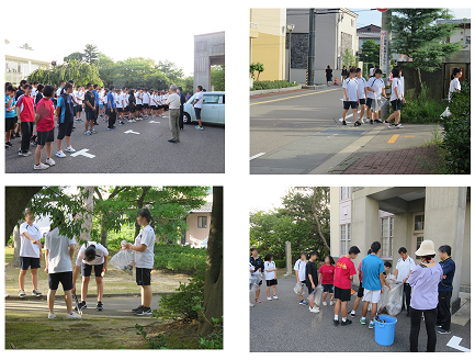 第1回の今回は吹奏楽部、男子バスケットボール部・柔道部・空手道部・男女ソフトテニス部・男女バドミントン部・茶道部・郷土研究部・放送部・筝曲部・新聞部・アクティブサイエンス部の生徒と環境委員が活動を行いました。