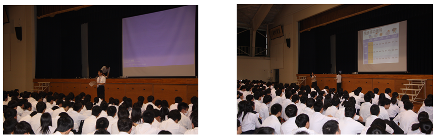 今回の3S歩行は、金沢市城北運動公園をスタートし、白尾を折り返し地点とするコースで行われます。スタート時間の変更や、コース上で道幅が狭いなどの危険な箇所の説明があり、間違えることのないようになどの注意がありました。また、3S歩行未体験の1年生のために昨年の様子を記録したDVDが上映され、1年生だけでなく2・3年生も昨年を思い出しながら、食い入るように見つめていました。その後、養護教諭から、体調管理に十分注意を払うようにし、完歩を目指す秘訣などの話がありました。