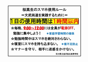 「桜高生のスマホ使用ルール」という教室掲示用ポスターをホームページに掲載いたしました。どうぞご覧ください。また、ダウンロードをしてご家庭でご活用いただけたら幸いです。