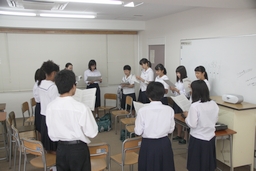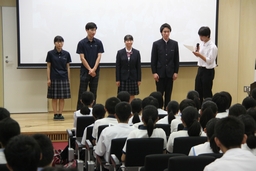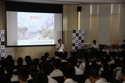 全体会では、学校概要の説明に続き放送部が製作したビデオ上映、生徒会によるクイズを交えた学校紹介を行いました。来年度の入学生から着用する新しい制服も披露されました。その後、部活動の体験や施設の見学を実施しました。
