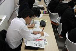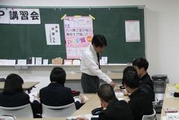 うつのみや書店の伴響さんを講師にお迎えして、第1回POP講習会が開催されました。図書委員や一般の生徒約50名が参加しました。
