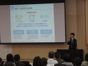 第2部の進路講演会では、株式会社ベネッセコーポレーションの木村文昭氏を招き、親子で考える文理選択と新入試制度についての講演をしていただきました。高大接続改革の方向性と、それに向けた望ましい学習スタイル、これからの社会で生きていく子どもたちに親ができるサポートについての具体的なお話をいただきました。