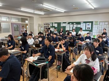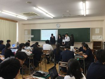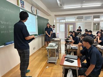 全クラスで課題研究のテーマ発表会が行われました。人文科学コースでは、質疑応答の型を学んだ後、発表を開始しました。研究当初から大学生がメンターとしてサポートに入り丁寧な対話を繰り返してくれたおかげもあり、各班、しっかりとした研究動機をもとに、テーマに関わる現状と今後の展望を語り、大変よい発表でした。その後に続く質疑応答では、最初に挙手してくれた生徒からよい影響が波及し、質問がたくさん出てきました。1時間で終えなければならないのがもったいなく感じるほど、よい発表会でした。初めて聴くクラスメートの研究テーマに刺激を受けた生徒が、今後どのような探究を進めていくのか楽しみです。
