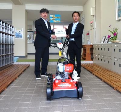 先日のPTA奉仕作業の折にもお伝えしましたが、本日、JAはくい様より草刈り機(四輪)の寄贈がありました。ランチルームの後ろや遊具広場、グラウンドなどで活躍してもらえそうです。また、多少の斜面でも使用可能だそうです。本当に助かります。ありがとうございました。大切に使用させていただきます。