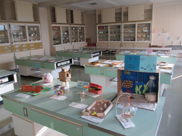 夏休みに取り組んだ工作や研究物を家庭室に展示しました。面白いアイディアを盛り込んだ作品や関心を持ったことをじっくり調べた研究物がたくさん並びました。子どもたちは展示してある作品を興味深く見ていました。